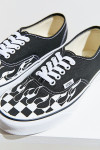 Original + simple low-top lace-up skate sneaker from Vans, finished in a sturdy canvas with a flame + checkerboard print at the toe. Features a Vans flag label and original waffle outsole on a vulcanized rubber base. California legend Vans “Off The Wall” remains the favorite shoemaker of skateboarders + surfers since 1966.